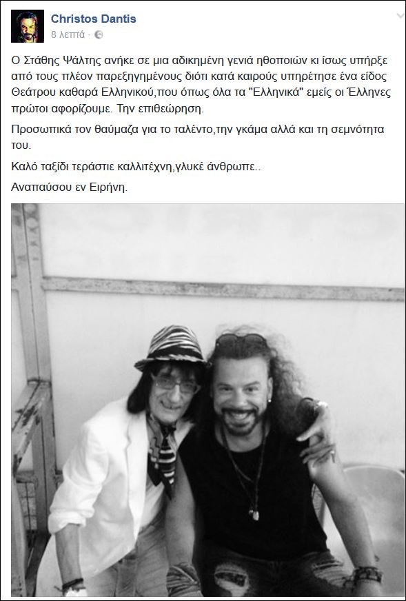Με μια συγκλονιστική ανάρτηση στον προσωπικό του λογαριασμό στο Facebook ο Χρήστος Δάντης αποχαιρέτησε τον Στάθη Ψάλτη. «Τον θαύμαζα για το ταλέντο, την γκάμα και τη σεμνότητα του», έγραψε μεταξύ άλλων ο γνωστός τραγουδιστής, που συνόδευσε το σχόλιο του με μια παλιά φωτογραφία, στην οποία ποζάρει χαμογελαστός μαζί με τον αγαπημένο ηθοποιό που έφυγε σήμερα από τη ζωή.Αναλυτικά η ανάρτηση του Χρήστου Δάντη:«Ο Στάθης Ψάλτης ανήκε σε μια αδικημένη γενιά ηθοποιών κι ίσως υπήρξε από τους πλέον παρεξηγημένους διότι κατά καιρούς υπηρέτησε ένα είδος Θεάτρου καθαρά Ελληνικού, που όπως όλα τα “Ελληνικά” εμείς οι Έλληνες πρώτοι αφορίζουμε. Την επιθεώρηση.Προσωπικά τον θαύμαζα για το ταλέντο, την γκάμα αλλά και τη σεμνότητα του.Καλό ταξίδι τεράστιε καλλιτέχνη, γλυκέ άνθρωπε..Αναπαύσου εν Ειρήνη».