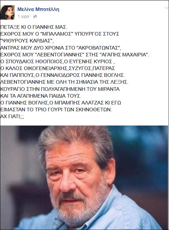 Η Μελίνα Μποτέλλη είχε συνεργαστεί με τον Γιάννη Βόγλη σε πολλές τηλεοπτικές σειρές. Συγκεκριμένα στους «Ψίθυρους καρδιάς», στο «Ακροβατώντας» και στης «Αγάπης μαχαιριά». Μέσω της προσωπικής της σελίδας στο Facebook, η Μελίνα Μποτέλλη αποχαιρέτησε τον σπουδαίο Γιάννη Βόγλη με ένα συγκλονιστικό μήνυμα: