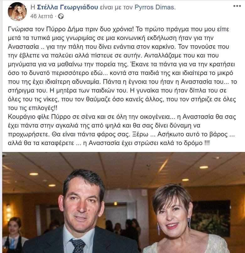 Η Στέλλα Γεωργιάδου έγραψε ένα πολύ συγκινητικό μήνυμα στην σελίδα του Πύρρου Δήμα στο Facebook για τον θάνατο της γυναίκας του Αναστασίας. Η γνωστή τραγουδίστρια τόνισε μεταξύ άλλων: “Έκανε τα πάντα για να την κρατήσει όσο το δυνατό περισσότερο εδώ… κοντά στα παιδιά της και ιδιαίτερα το μικρό που της έχει ιδιαίτερη αδυναμία. Πάντα η έγνοια του ήταν η Αναστασία του… το στήριγμα του”.