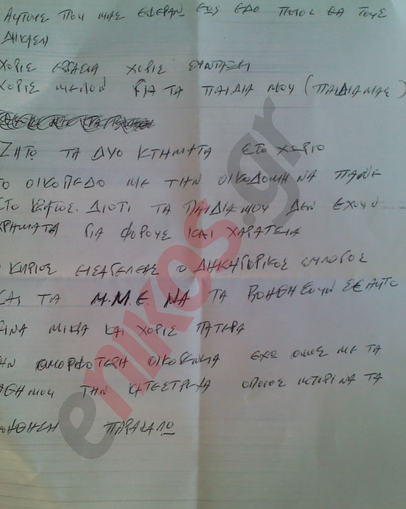 Διαβάστε το συγκλονιστικό ιδιόχειρο σημείωμα που άφησε ο 56χρονος άνδρας που αυτοκτόνησε πριν από δύο μέρες στην Εύβοια. Ο απελπισμένος πατέρας που αυτοπυροβολήθηκε στην παραλία προχθές τα ξημερώματα με το όπλο του άφησε ορφανά δύο παιδιά.Δυστυχώς αποτυπώνεται ανάγλυφα η απόγνωση του κόσμου μετά τις αποφάσεις των «κυρίων» της Ευρώπης που καθορίζουν τύχες και κατευθύνουν ζωές προς το απονενοημένο διάβημα.Διαβάστε μερικά από τα ανατριχιαστικά λόγια του αυτόχειρα:«Ζητώ τα δύο κτήματα στο χωριό, το οικόπεδο με την οικοδομή να πάνε στο κράτος. Διότι τα παιδιά μου δεν έχουν χρήματα για φόρους και χαράτσια».