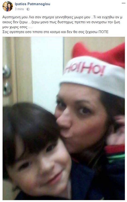 “Αγαπημένη μου Λία, σαν σήμερα γεννήθηκες μωρό μου… Τι να ευχηθώ αν με ακούς δεν ξέρω… ξέρω μόνο πως δυστυχώς πρέπει να συνεχίσω τη ζωή μου χωρίς εσάς… Σας αγάπησα όσο τίποτα στον κόσμο και δεν θα σας ξεχάσω ΠΟΤΕ…”, έγραψε χαρακτηριστικά ο Υπάτιος Πατμάνογλου, αναρτώντας μία φωτογραφία της συζύγου και του γιου του.