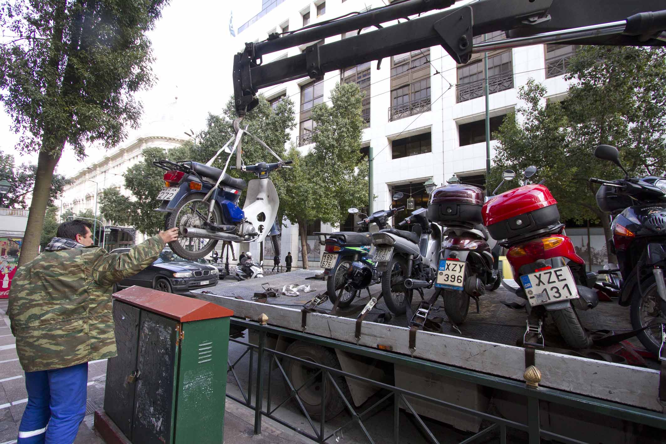 Επιχείρηση ”σκούπα” πραγματοποιεί αυτή την ώρα η αστυνομία στο κέντρο της Αθήνας, στην οδό Σταδίου, απομακρύνοντας με γερανό όσα μηχανάκια βρίσκονται παράνομα παρκαρισμένα.Μάταια οι ιδιοκτήτες τους προσπάθησαν να μεταπείσουν τους αστυνομικούς για γλυτώσουν το… δίκυκλο τους. Τελικά έμειναν και χωρίς μηχανάκι και θα πληρώσουν το τσουχτερό αντίτιμο της κλήσης που τους επιβλήθηκε.