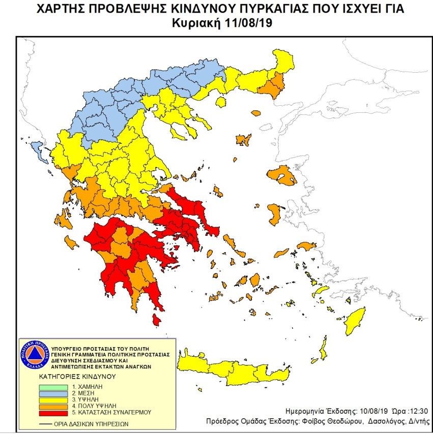 Ακραίος κίνδυνος για την εκδήλωση πυρκαγιάς προβλέπεται για σήμερα, Κυριακή, σύμφωνα με τον Χάρτη Πρόβλεψης Κινδύνου Πυρκαγιάς που εξέδωσε η Γενική Γραμματεία Πολιτικής Προστασίας του Υπουργείου Προστασίας του Πολίτη.