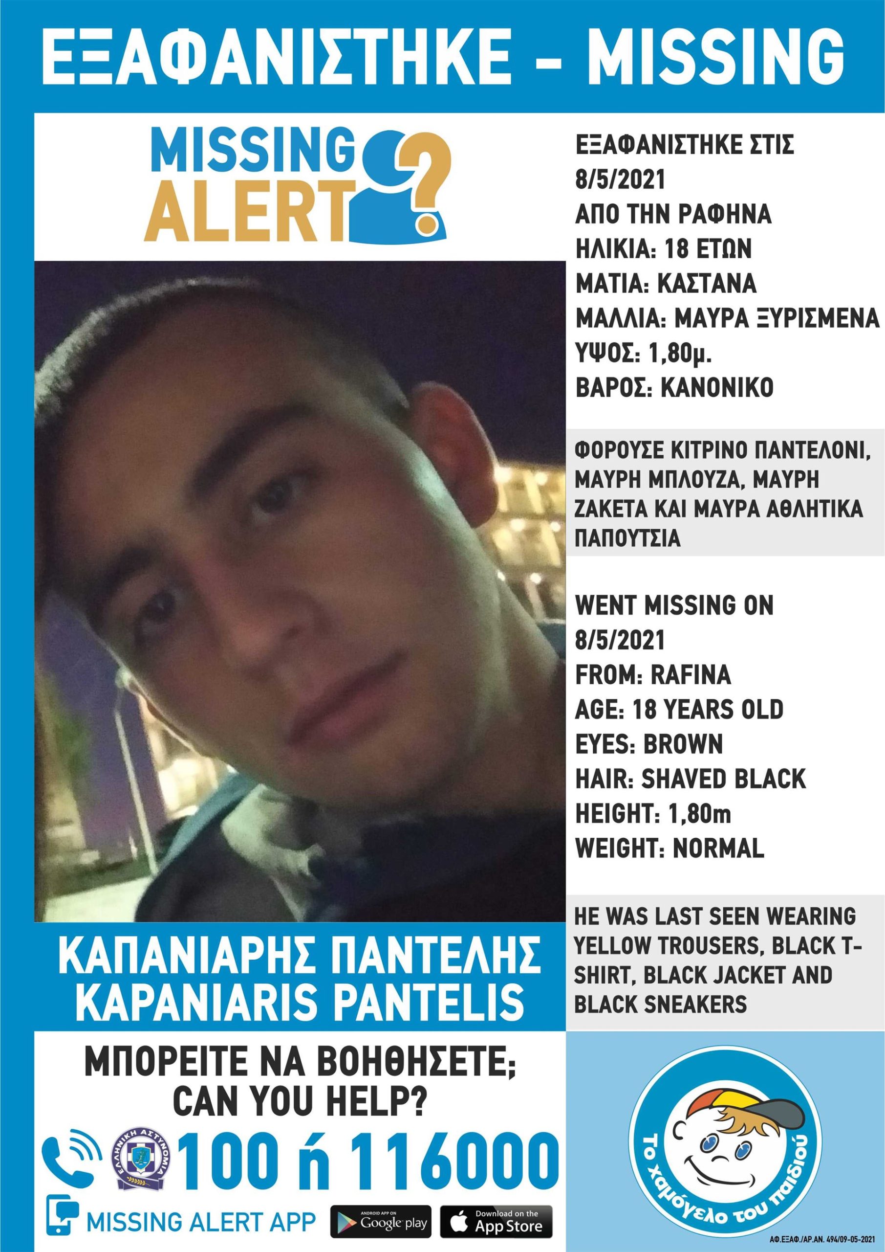 Την κινητοποίηση των Αρχών έχει προκαλέσει η εξαφάνιση ενός 18χρονου, από τη Ραφήνα. Τα ίχνη του Παντελή Καπανιάρη χάθηκαν στις 8 Μαΐου και μία ημέρα αργότερα ενημερώθηκε το «Χαμόγελο του Παιδιού» που προχώρησε στη δημοσιοποίηση των στοιχείων του κατόπιν αιτήματος της οικογένειάς του καθώς ενδέχεται να συντρέχουν λόγοι οι οποίοι θέτουν τη ζωή του σε κίνδυνο.