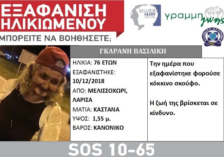 Πρόκειται για την Βασιλική Γκαράνη, της οποίας τα ίχνη χάθηκαν στις 10 Δεκεμβρίου από το Μελισσοχώρι της Λάρισας.
