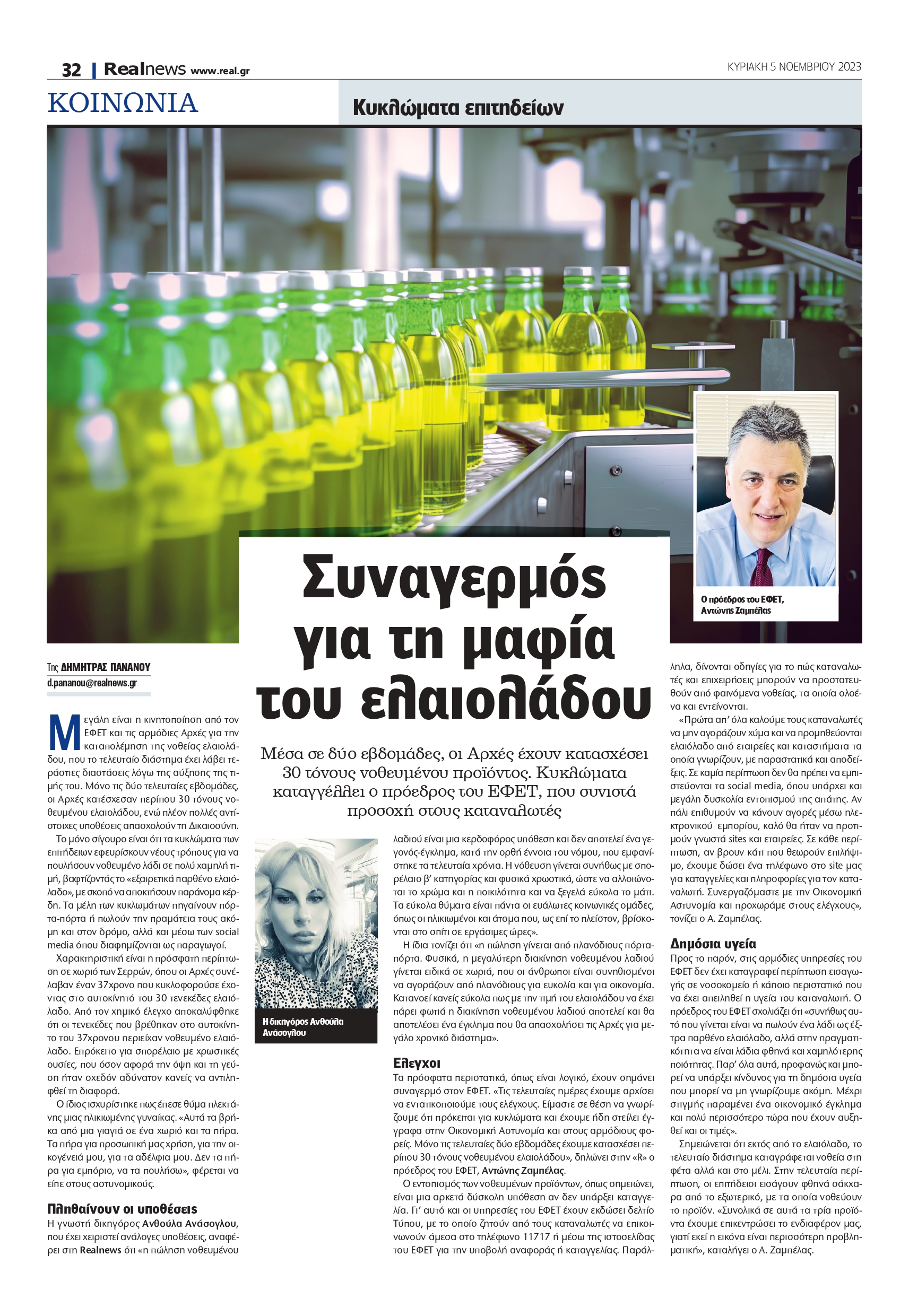 Τα πρόσφατα περιστατικά, όπως είναι λογικό, έχουν σημάνει συναγερμό στον ΕΦΕΤ. «Τις τελευταίες ημέρες έχουμε αρχίσει να εντατικοποιούμε τους ελέγχους. Είμαστε σε θέση να γνωρίζουμε ότι πρόκειται για κυκλώματα και έχουμε ήδη στείλει έγγραφα στην Οικονομική Αστυνομία και στους αρμόδιους φορείς. Μόνο τις τελευταίες δύο εβδομάδες έχουμε κατασχέσει περίπου 30 τόνους νοθευμένου ελαιολάδου», δηλώνει στην «R» ο πρόεδρος του ΕΦΕΤ, Αντώνης Ζαμπέλας.