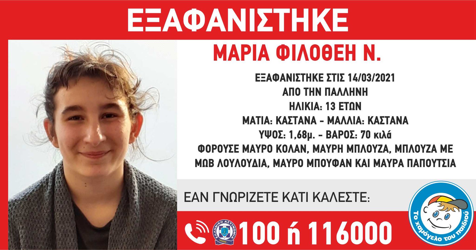 Το Χαμόγελο του Παιδιού δημοσιοποίησε τη φωτογραφία και τα στοιχεία της 13χρονης ώστε όποιος έχει πληροφορίες για το που βρίσκεται το κορίτσι να επικοινωνήσει είτε με τον Οργανισμό είτε με τις αρχές.