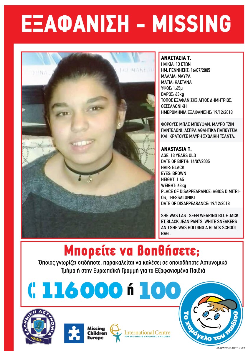 Συναγερμός έχει σημάνει στις Αρχές μετά την εξαφάνιση της 13χρονης Αναστασίας Τ. από τον Άγιο Δημήτριο Θεσσαλονίκης. Τα ίχνη της χάθηκαν σήμερα το πρωί.