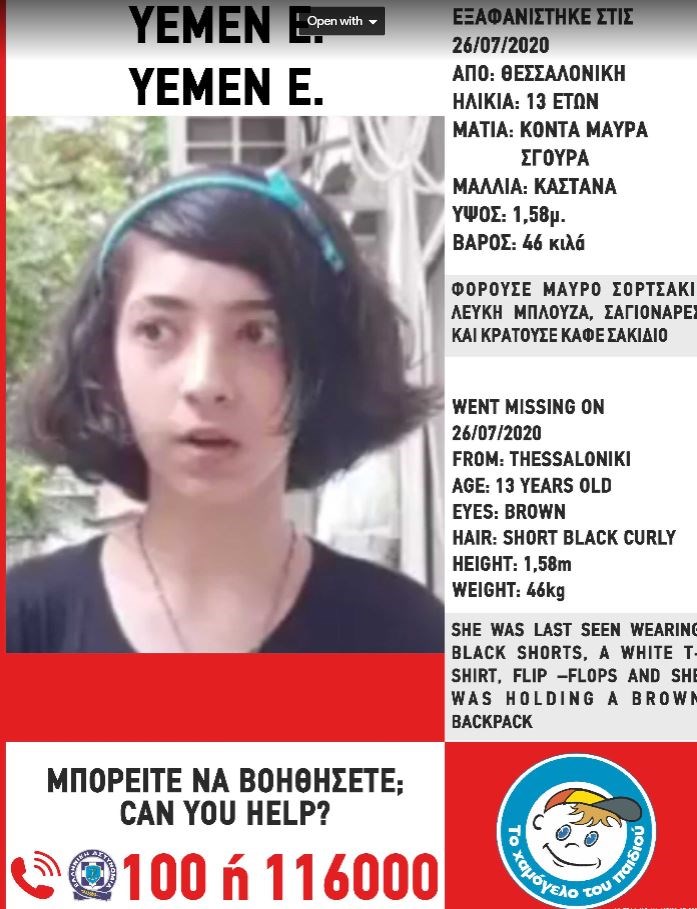«Το Χαμόγελο του Παιδιού» ενημερώθηκε για την εξαφάνιση της Υεμέν Ε. σήμερα, 29/07/2020, και προχώρησε άμεσα στη δημοσιοποίηση των στοιχείων της.