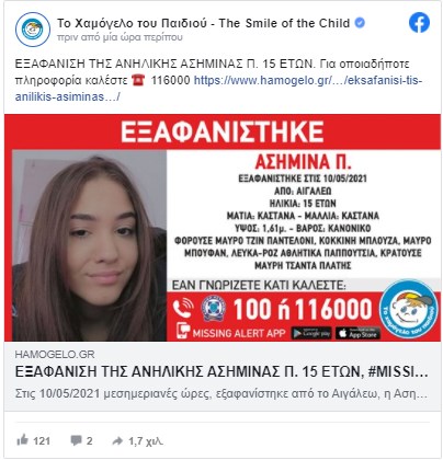 Κατόπιν αιτήματος της οικογένειας σήμερα 12/05/2021, “Το Χαμόγελο του Παιδιού” προέβη στην δημοσιοποίηση των στοιχείων της ανήλικης Ασημίνας Π. Η Ασημίνα Π. έχει ύψος 1,61 μ., κανονικό βάρος, έχει καστανά μαλλιά και καστανά μάτια. Φορούσε μαύρο τζίν παντελόνι, κόκκινη μπλούζα, μαύρο μπουφάν, λευκά-ροζ αθλητικά παπούτσια και κρατούσε μαύρη τσάντα πλάτης.