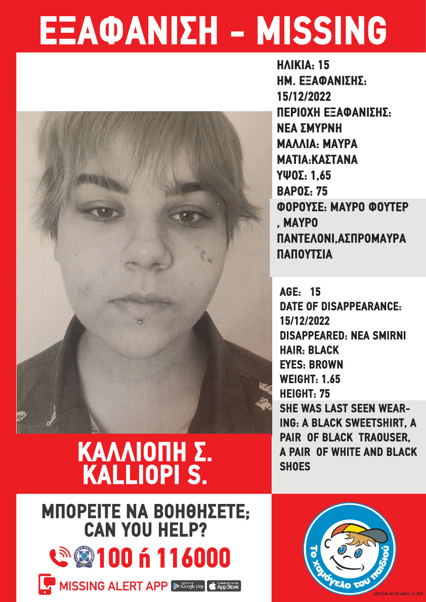 «Το Χαμόγελο του Παιδιού» ενημερώθηκε σήμερα 16/12/2022 και προχώρησε στη δημοσιοποίηση των στοιχείων της ανήλικης κατόπιν εισαγγελικής εντολής, καθώς συντρέχουν λόγοι που θέτουν τη ζωή της σε κίνδυνο.