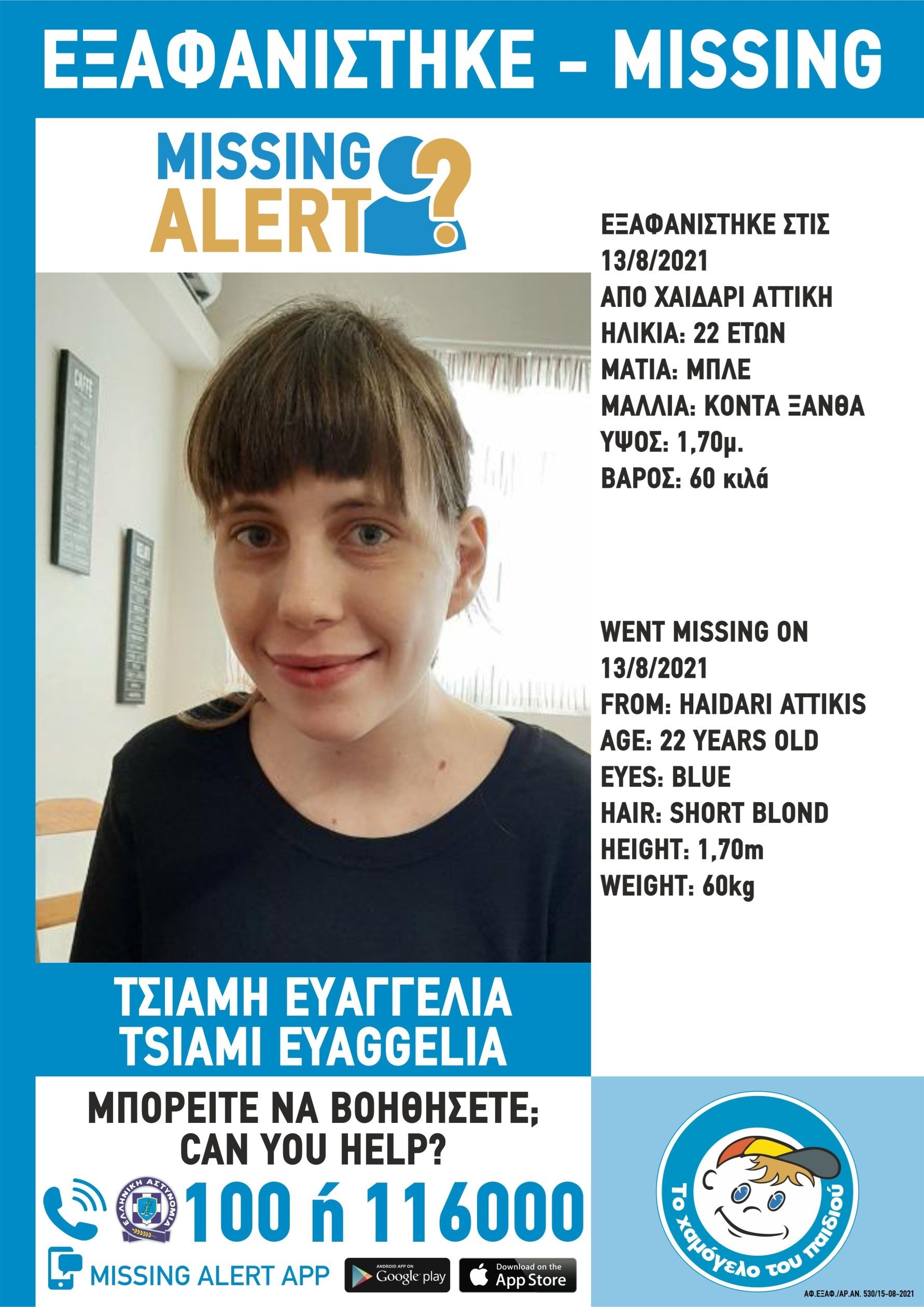 Οποιοσδήποτε έχει κάποια πληροφορία, παρακαλείται να επικοινωνήσει τηλεφωνικά με «Το Χαμόγελο του Παιδιού» όλο το 24ωρο, στην «Ευρωπαϊκή Γραμμή για τις Εξαφανίσεις», σε όλα τα Αστυνομικά Τμήματα της χώρας αλλά και μέσω της εφαρμογής MissingAlertapp οπού υπάρχει ζωντανή ενημέρωση για την εξαφάνιση. Μπορείτε να την κατεβάσετε για Android κινητά εδώ http://bit.ly/missing-alert-android και για Apple κινητά εδώ http://bit.ly/missing-alert-apple