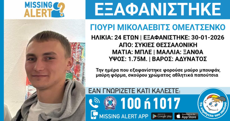 Ένας 24χρονος εξαφανίστηκε το απόγευμα της Πέμπτης 30/1 από τη Θεσσαλονίκη, σύμφωνα με ανακοίνωση του Χαμόγελου του Παιδιού.