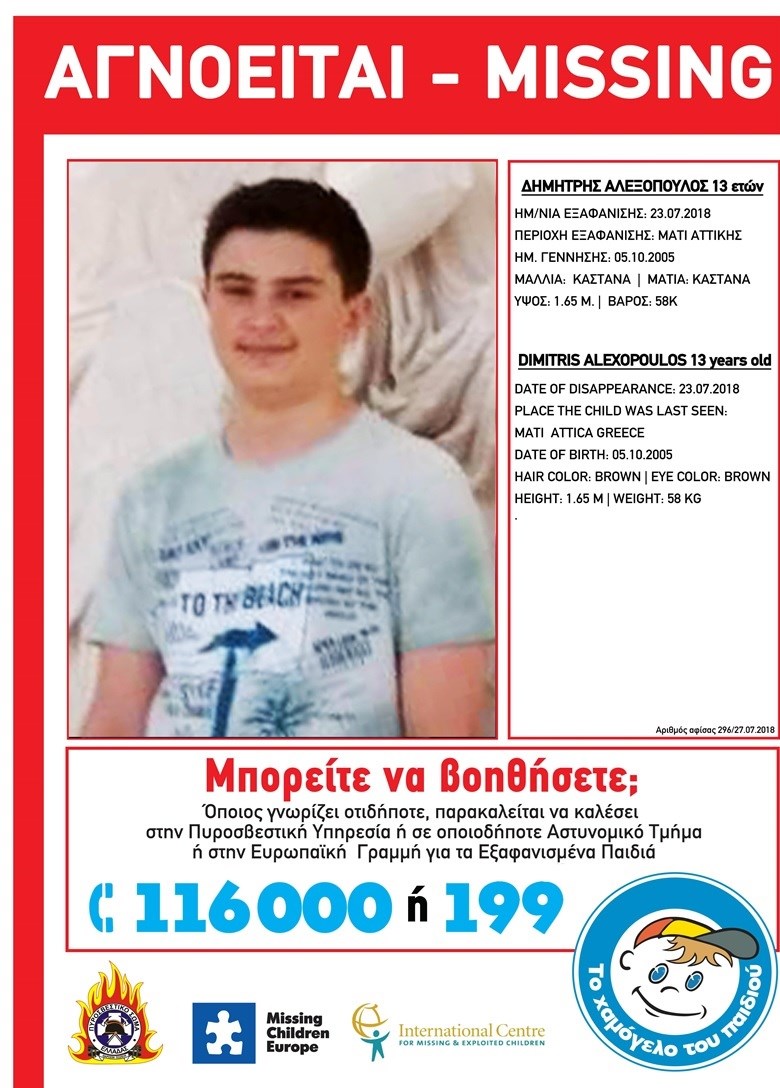Αγωνία για την τύχη του 13χρονου Δημήτρη Αλεξόπουλου. Το ανήλικο παιδί είναι ανάμεσα στους αγνοούμενους από τη φονική πυρκαγιά στο Μάτι Αττικής.