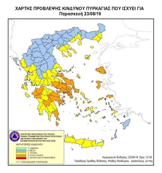 Σύμφωνα με το Χάρτη Πρόβλεψης Κινδύνου Πυρκαγιάς για την Παρασκευή 23 Αυγούστου 2019, προβλέπεται πολύ υψηλός κίνδυνος πυρκαγιάς (κατηγορία κινδύνου 4) για τις εξής περιοχές: