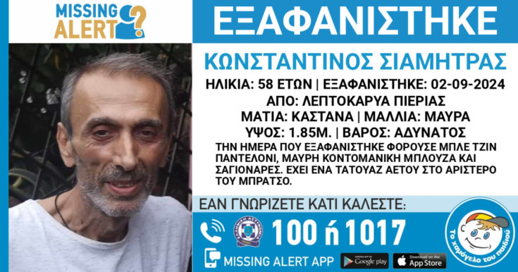 Ο 58χρονος Κωνσταντίνος Σιαμήτρας εξαφανίστηκε το μεσημέρι της Δευτέρας 2 Σεπτεμβρίου από την περιοχή της Λεπτοκαρυάς Πιερίας, σύμφωνα με ανακοίνωση του Οργανισμού «Το Χαμόγελο του Παιδιού».