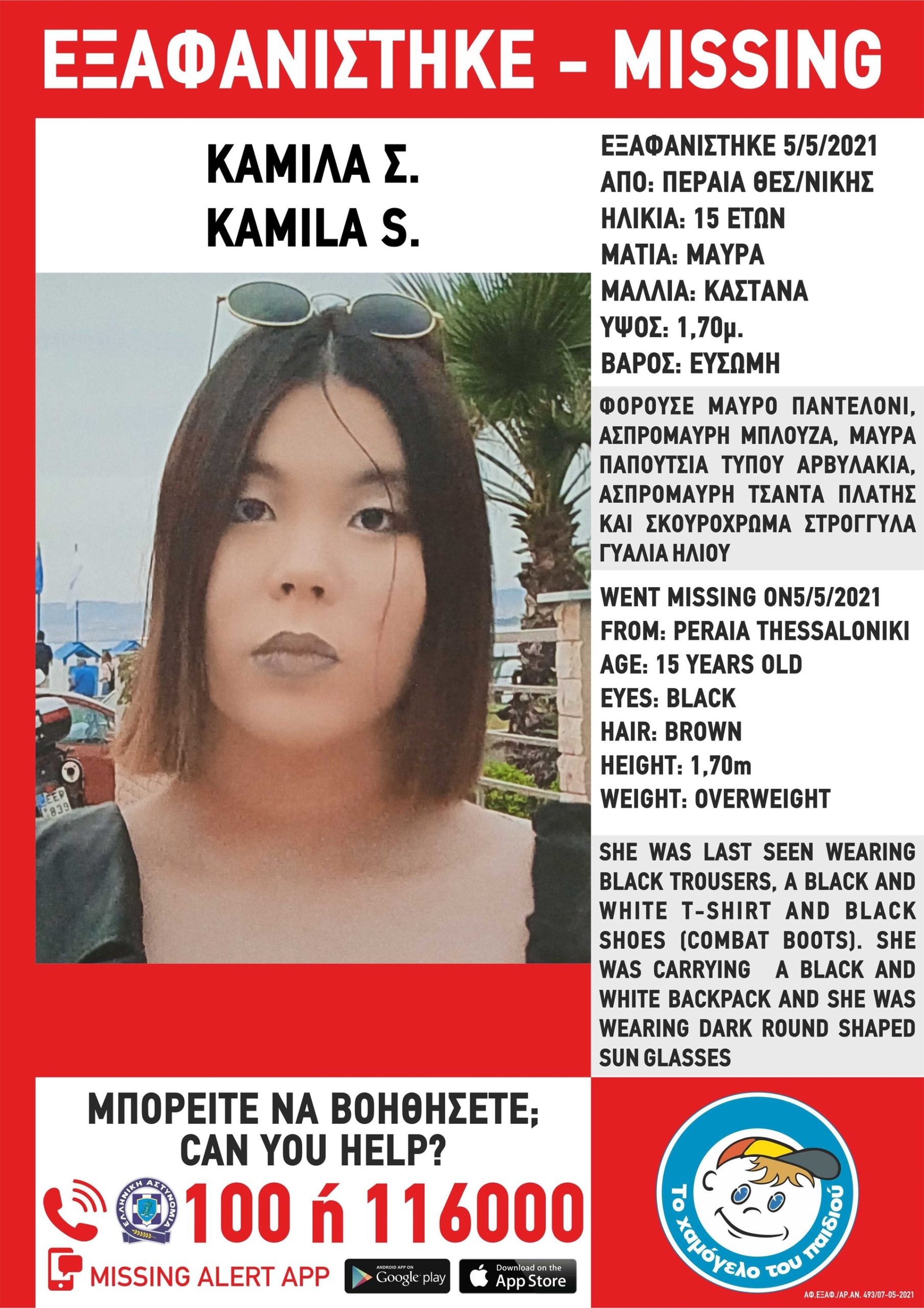 Συναγερμός έχει σημάνει στις Αρχές της Θεσσαλονίκης, καθώς εξαφανίστηκε 15χρονη στην περιοχή της Περαίας. Συγκεκριμένα, στις 5/5/2021 στις 20:00, εξαφανίστηκε από το σπίτι της, η Καμίλα Σ., 15 ετών, με καταγωγή από το Καζακστάν. Η Καμίλα Σ. έχει ύψος 1.70 μ., είναι εύσωμη, έχει καστανά μαλλιά (κοντά και ξυρισμένα στο πλάι) και μαύρα μάτια. Φορούσε μαύρο παντελόνι, ασπρόμαυρη μπλούζα, μαύρα παπούτσια τύπου αρβυλάκια και είχε μαζί της ασπρόμαυρη τσάντα πλάτης και σκούρα στρόγγυλα γυαλιά ηλίου.