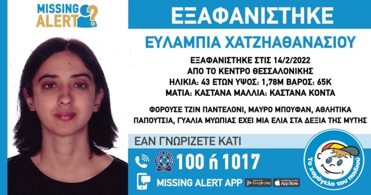 Συναγερμός έχει σημάνει στις Αρχές για την εξαφάνιση 43χρονης στη Θεσσαλονίκη. Πρόκειται για την Ευλαμπία Χατζηαθανασίου, τα ίχνη της οποίας χάθηκαν στις 14 Φεβρουαρίου από την περιοχή του Κέντρου της Θεσσαλονίκης.