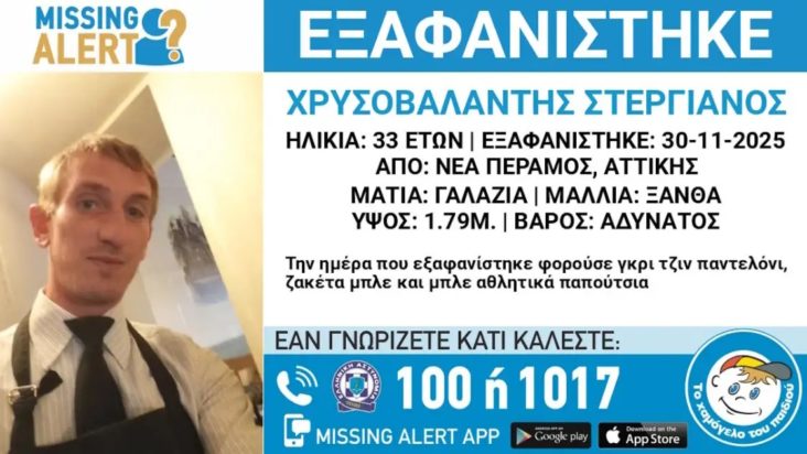 Συναγερμός έχει σημάνει στη Νέα Πέραμο Αττικής για την εξαφάνιση του 33χρονου Χρυσοβαλάντη Στεργιανού. Το «Χαμόγελο του Παιδιού» δημοσιοποίησε το βράδυ της Παρασκευής 5 Δεκεμβρίου 2025 σχετική ανακοίνωση, έπειτα από ενημέρωση που έλαβε από τους οικείους του.