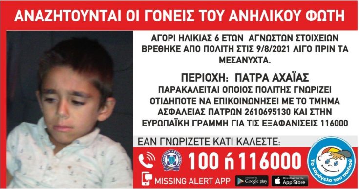 Ένας εξάχρονος βρέθηκε να περιπλανιέται μόνος του στην Πάτρα, στην περιοχή της Αγίας Σοφίας. Το Χαμόγελο του Παιδιού κινητοποιήθηκε και δόθηκε στη δημοσιότητα η φωτογραφία του με εντολή εισαγγελέα, προκειμένου να διακριβωθούν τα στοιχεία του παιδιού και να εντοπιστούν οι γονείς του. Η ανακοίνωση του Χαμόγελου του Παιδιού αναφέρει τα εξής:
