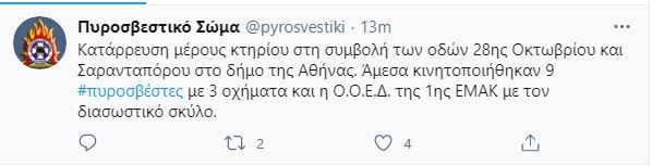 Συναγερμός σήμανε στην Πυροσβεστική. Κατέρρευσε μέρος κτιρίου στη συμβολή των οδών 28ης Οκτωβρίου και Σαρανταπόρου στα Άνω Πατήσια. Άμεσα κινητοποιήθηκαν εννέα πυροσβέστες με τρία οχήματα και η Ο.Ο.Ε.Δ. της 1ης ΕΜΑΚ με τον διασωστικό σκύλο.