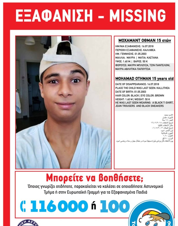 «Συναγερμός» έχει σημάνει στις Αρχές για τον εντοπισμό του 15χρονου, Μοχαμάντ Οθμάν, του οποίου τα ίχνη χάθηκαν το μεσημέρι της 16ης Ιουλίου στην Καλλιθέα.Ο 15χρονος συριακής καταγωγής εξαφανίστηκε από το σπίτι του στην Καλλιθέα και το «Χαμόγελο του Παιδιού» εξέδωσε missing alert στο οποίο αναφέρει ότι «λάβαμε τα απαραίτητα στοιχεία του παιδιού, καθώς και την έγκριση από τις αρμόδιες αρχές, προκειμένου να προβούμε στη δημοσιοποίησή τους».Ο Μοχάμαντ (ον.) ‘Οθμαν (επ.) έχει ύψος 1.60 μ., ζυγίζει 50 κιλά και έχει μαύρα μαλλιά και καστανά μάτια.Φορούσε τζιν παντελόνι, μαύρη μπλούζα και μαύρα αθλητικά παπούτσια.Οποιοσδήποτε έχει κάποια πληροφορία, παρακαλείται να επικοινωνήσει τηλεφωνικά με «Το Χαμόγελοτου Παιδιού», όλο το 24ωρο, στην «Ευρωπαϊκή Γραμμή για τα Εξαφανισμένα Παιδιά 116000» καθώς και σε όλα τα Αστυνομικά Τμήματα της χώρας.Δείτε την ανακοίνωση: