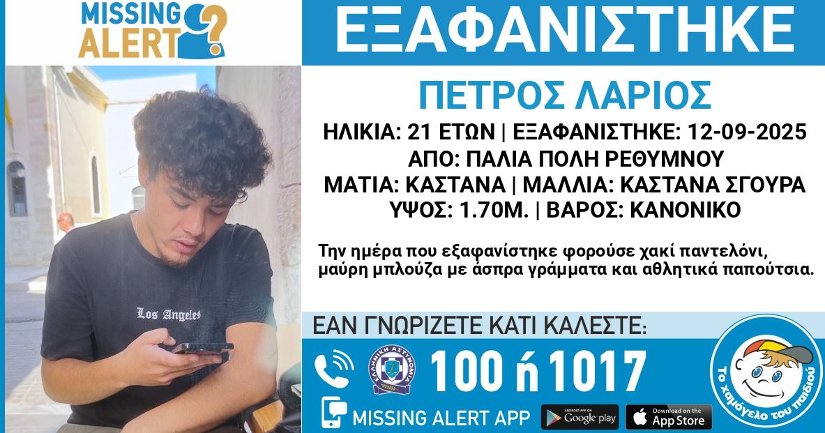 «Στις 12/09/2025, βραδινές ώρες, εξαφανίστηκε από την περιοχή της Παλιάς Πόλης Ρεθύμνου ο Πέτρος Λάριος, 21 ετών. «Το Χαμόγελο του Παιδιού» ενημερώθηκε για την εξαφάνιση του σήμερα 14/09/2025, και προχώρησε στη δημοσιοποίηση των στοιχείων του κατόπιν αιτήματος της οικογένειας του, καθώς ενδέχεται να συντρέχουν λόγοι οι οποίοι θέτουν τη ζωή του σε κίνδυνο. Ο Πέτρος Λάριος έχει ύψος 1,70μ. και κανονικό βάρος, έχει καστανά σγουρά μαλλιά και καστανά μάτια. Την ημέρα που εξαφανίστηκε φορούσε χακί παντελόνι, μαύρη μπλούζα με άσπρα γράμματα και αθλητικά παπούτσια».