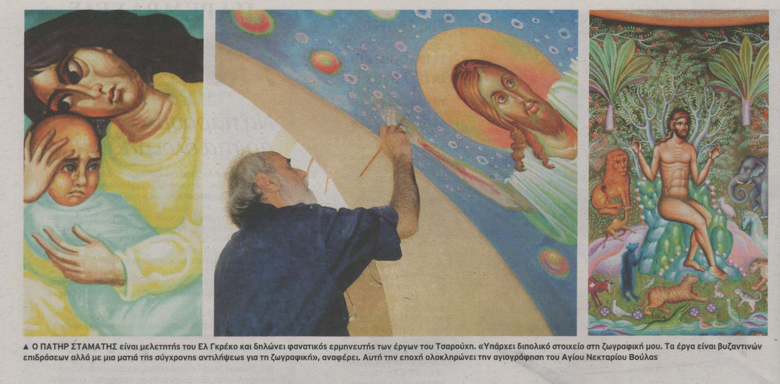 Όταν δεν ασκεί τα ιερατικά του καθήκοντα στην Αγία Σκέπη του Παπάγου, πιάνει τα πινέλα του και δημιουργεί. Πότε σε καμβάδες, γυρίζοντας τον κόσμο, πότε σε τρούλους εκκλησιών.