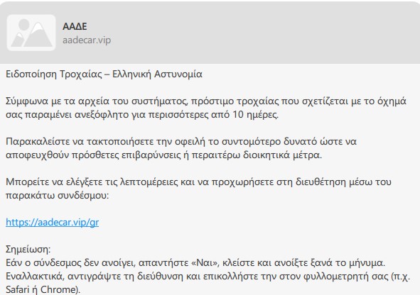 Στο περιεχόμενο των μηνυμάτων, οι αποδέκτες ενημερώνονται για υποτιθέμενο ανεξόφλητο πρόστιμο και καλούνται να προχωρήσουν άμεσα σε πληρωμή, προκειμένου να αποφύγουν πρόσθετες χρεώσεις ή πιθανές νομικές συνέπειες. Παράλληλα, παρατίθεται σύνδεσμος μέσω του οποίου ζητείται η ολοκλήρωση της διαδικασίας πληρωμής, χωρίς να παρέχεται οποιαδήποτε επιβεβαίωση της γνησιότητας της ειδοποίησης.