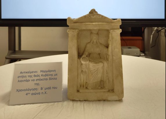 Στο πλαίσιο της έρευνας, εντοπίστηκε κρυμμένη σε πατάρι και κατασχέθηκε μια μαρμάρινη ναόσχημη αναθηματική στήλη (ένθρονη θεά Κυβέλη με ένα λιοντάρι δίπλα της), η οποία χρονολογείται στον 4ο π.Χ. αιώνα.