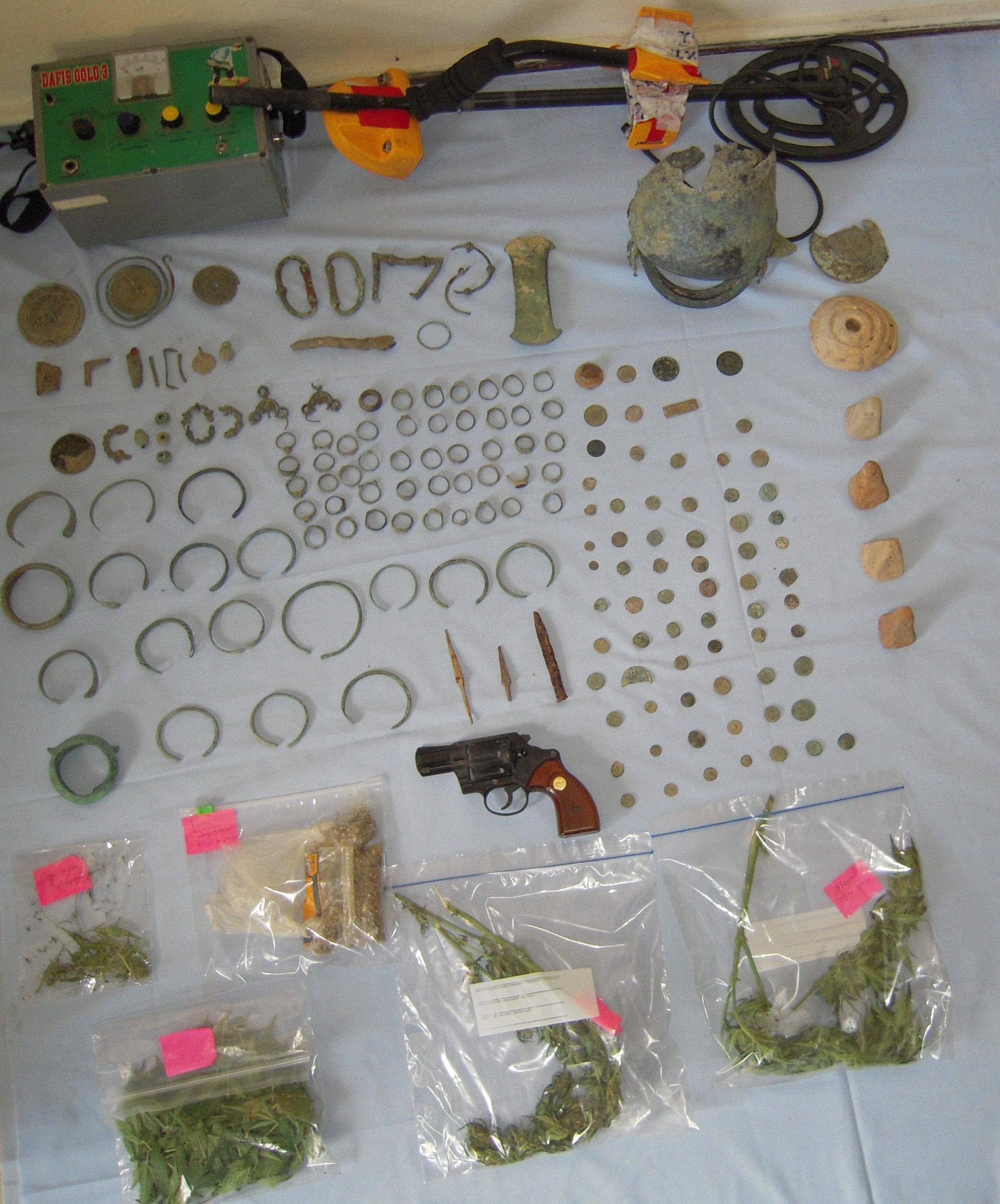 Από το ίδιο σημείο κατασχέθηκαν μεταξύ άλλων μικροποσότητες αποξηραμένων και νωπών φύλλων κάνναβης, σπόροι και κλαδιά κάνναβης, ένα περίστροφο κρότου-αερίων, ένας ανιχνευτής μετάλλων.