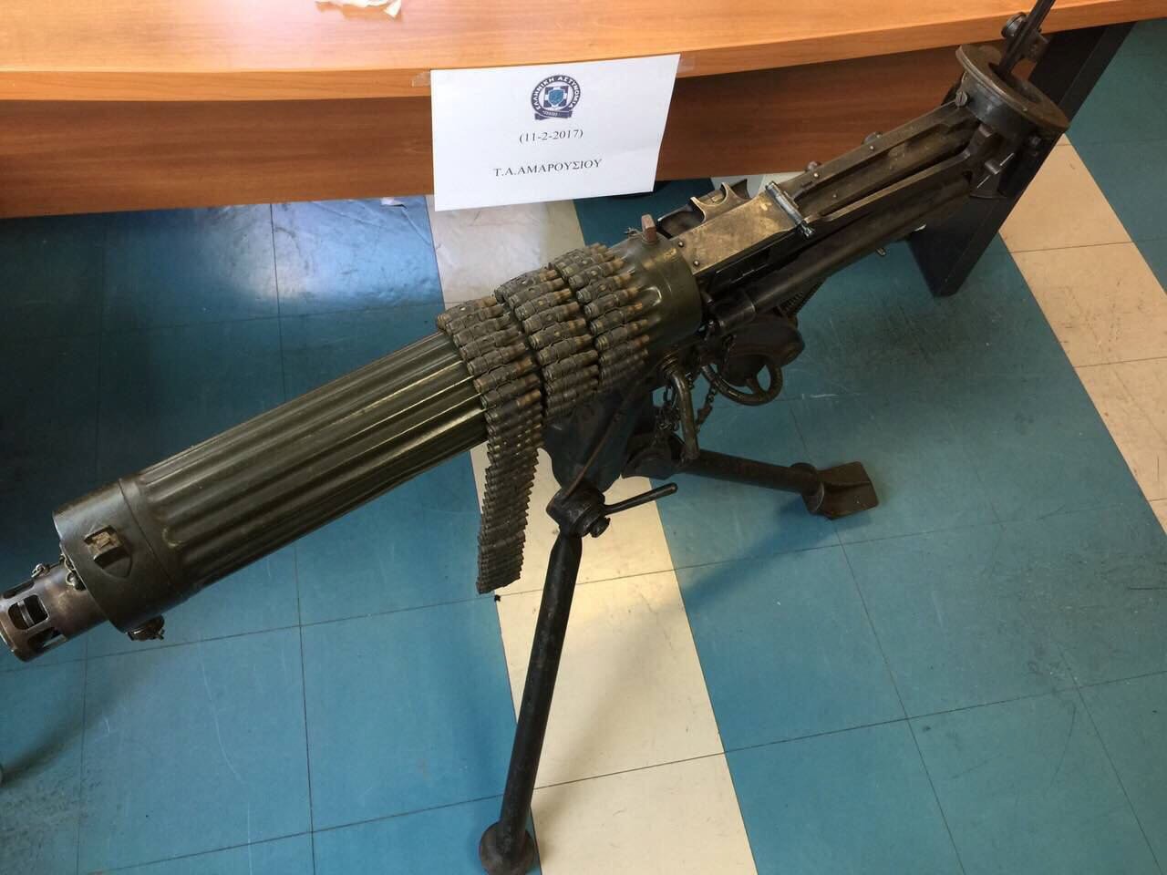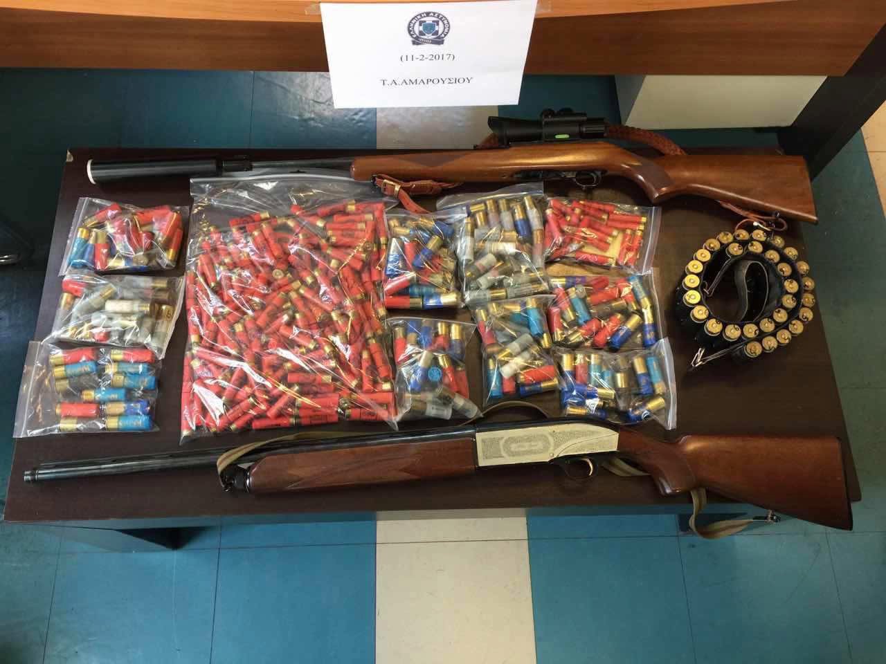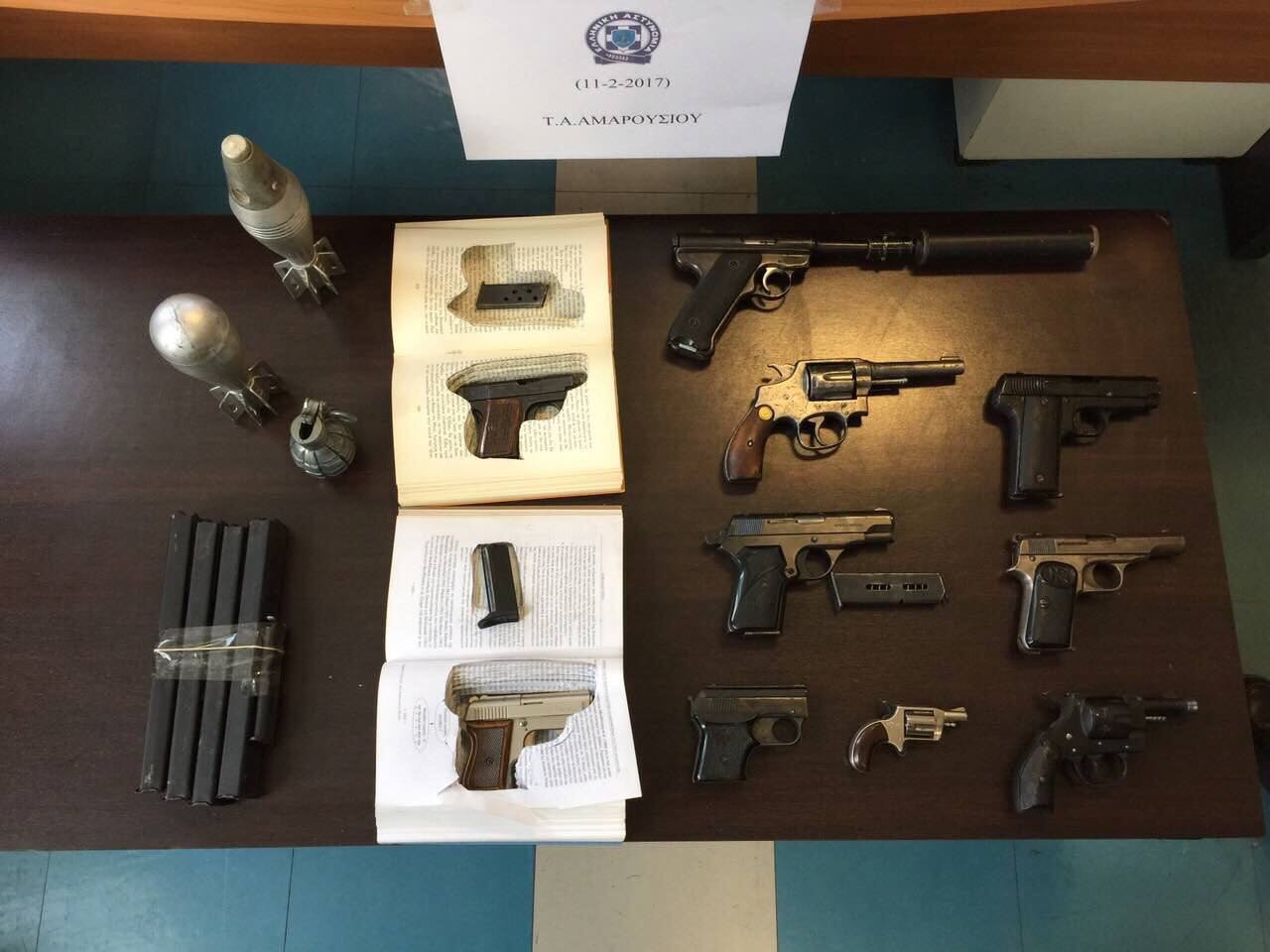 Ακόμη, στο σπίτι του συλληφθέντα η αστυνομία βρήκε: δύο βλήματα όλμων, ανενεργά Β΄ Παγκοσμίου Πολέμου, επτά πιστόλια και πέντε γεμιστήρες, τρία περίστροφα, μία επαναληπτική καραμπίνα, με τροποποιημένο γεμιστήρα, ένα τυφέκιο με διόπτρα και σιγαστήρα, πλήθος φυσιγγιών, διαφόρων διαμετρημάτων, μία χειροβομβίδα αμυντικού τύπου ανενεργή, μία πτυσσόμενη μεταλλική ράβδο, μαχαίρια και σουγιάδες, ξίφη, σπαθιά και ένα ξιφίδιο.