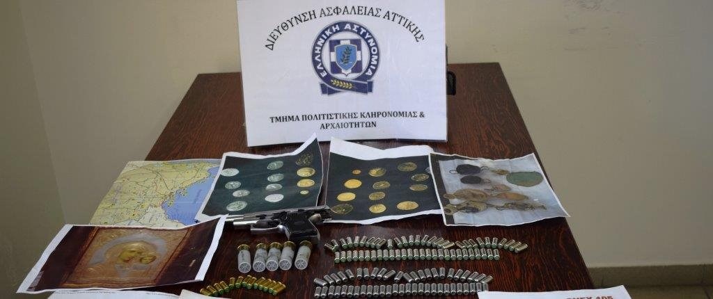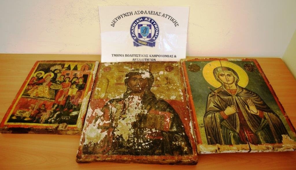 Συγκεκριμένα, σε έρευνες που πραγματοποιήθηκαν σε χώρους καθώς και στο σπίτι τους , βρέθηκαν και κατασχέθηκαν μια ξύλινη εικόνα που απεικονίζει την “Γέννηση της Θεοτόκου” διαστάσεων 41Χ32 εκ., μεταβυζαντινής τεχνοτροπίας. Ξύλινη εικόνα που απεικονίζει τον “Ιησού Χριστό” με Αρχιερατική ενδυμασία διαστάσεων 52Χ41 εκ., χρονολογούμενη στον 18ο αιώνα, μεταβυζαντινής τεχνοτροπίας. Ξύλινη εικόνα που απεικονίζει την “Παναγία δεόμενη” διαστάσεων 50Χ39 εκ., μεταβυζαντινής τεχνοτροπίας. Επίσης κατασχέθηκαν ένας ανιχνευτής μετάλλων, χάρτης με σημειώσεις, έξι καραμπίνες, πιστόλι κρότου λάμψης και πλήθος αβολίδωτων φυσιγγίων.