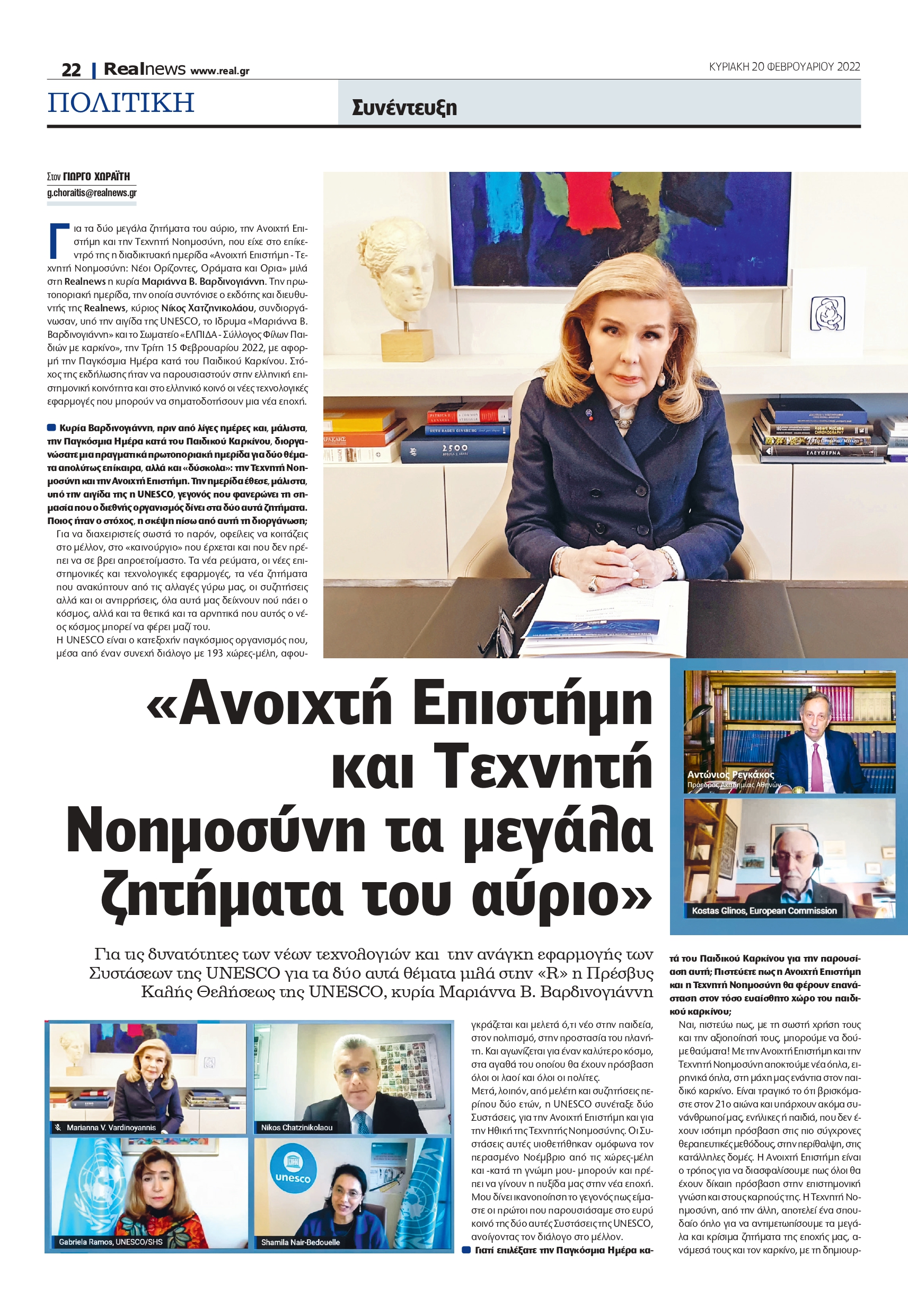 Για τα δύο μεγάλα ζητήματα του αύριο, την Ανοιχτή Επιστήμη και την Τεχνητή Νοημοσύνη, που είχε στο επίκεντρό της η διαδικτυακή ημερίδα «Ανοιχτή Επιστήμη – Τεχνητή Νοημοσύνη: Νέοι Ορίζοντες, Οράματα και Ορια» μιλά στη Realnews η κυρία Μαριάννα Β. Βαρδινογιάννη. Την πρωτοποριακή ημερίδα, την οποία συντόνισε ο εκδότης και διευθυντής της Realnews, κύριος Νίκος Χατζηνικολάου, συνδιοργάνωσαν, υπό την αιγίδα της UNESCO, το Ιδρυμα «Μαριάννα Β. Βαρδινογιάννη» και το Σωματείο «ΕΛΠΙΔΑ – Σύλλογος Φίλων Παιδιών με καρκίνο», την Τρίτη 15 Φεβρουαρίου 2022, με αφορμή την Παγκόσμια Ημέρα κατά του Παιδικού Καρκίνου.