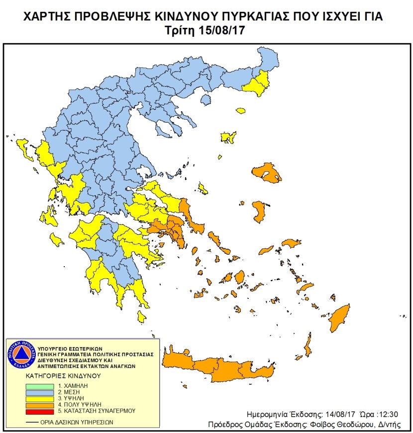 Ειδικότερα, ο χάρτης πρόβλεψης κινδύνου πυρκαγιάς για σήμερα δίνει πολύ υψηλό κίνδυνο (δείκτης 4) σε όλη την Αττική, τη νότια Εύβοια, τα νησιά του Αιγαίου και την Κρήτη.