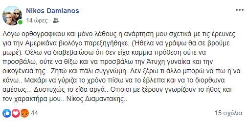 Με νέα ανάρτηση στον προσωπικό του λογαριασμό στο facebook, ο Νίκος Διαμαντάκης σημειώνει: «Λόγω ορθογραφικού και μόνο λάθους η ανάρτηση μου σχετικά με τις έρευνες για την Αμερικάνα βιολόγο παρεξηγήθηκε, (Ήθελα να γράψω θα σε βρούμε μωρέ). Θέλω να διαβεβαιώσω ότι δεν είχα καμία πρόθεση ούτε να προσβάλω, ούτε να θίξω και να προσβάλω την άτυχη γυναίκα και την οικογένειά της… Ζητώ και πάλι συγγνώμη. Όποιοι με ξέρουν γνωρίζουν το ήθος και τον χαρακτήρα μου.. Νίκος Διαμαντάκης..».