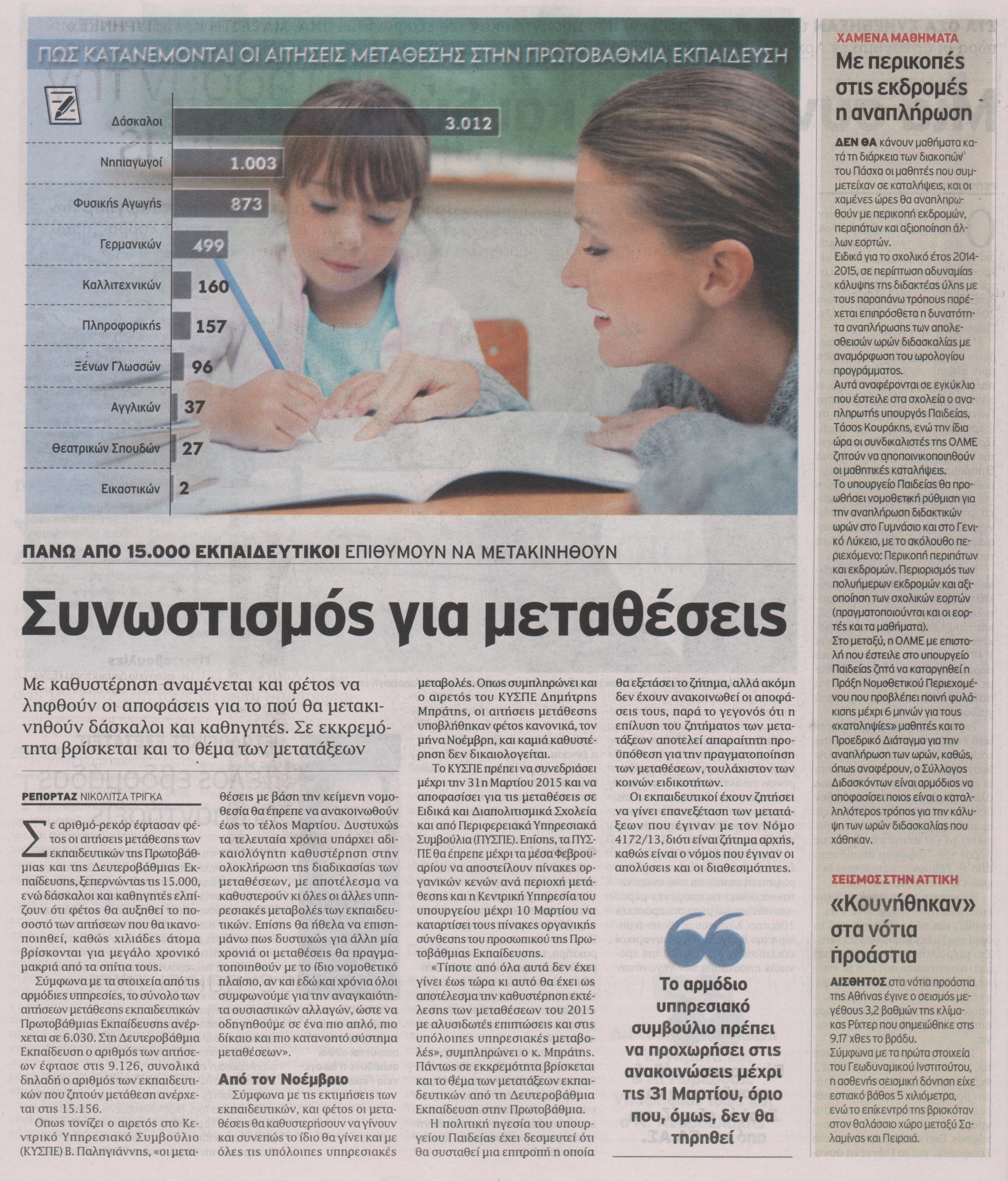 Στη Δευτεροβάθμια Εκπαίδευση ο αριθμός των αιτήσεων έφτασε στις 9.126, συνολικά δηλαδή ο αριθμός των εκπαιδευτικών που ζητούν μετάθεση ανέρχεται στις 15.156.