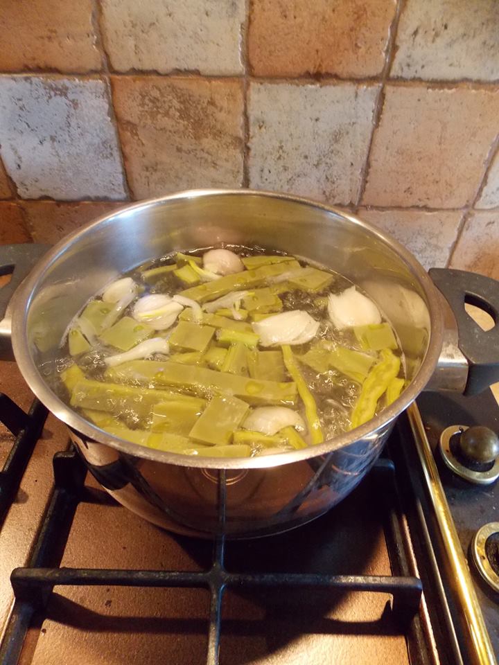 – Βράζουμε νερό με ένα κρεμμύδι και ένα σκόρδο (τα οποία πετάμε μετά).