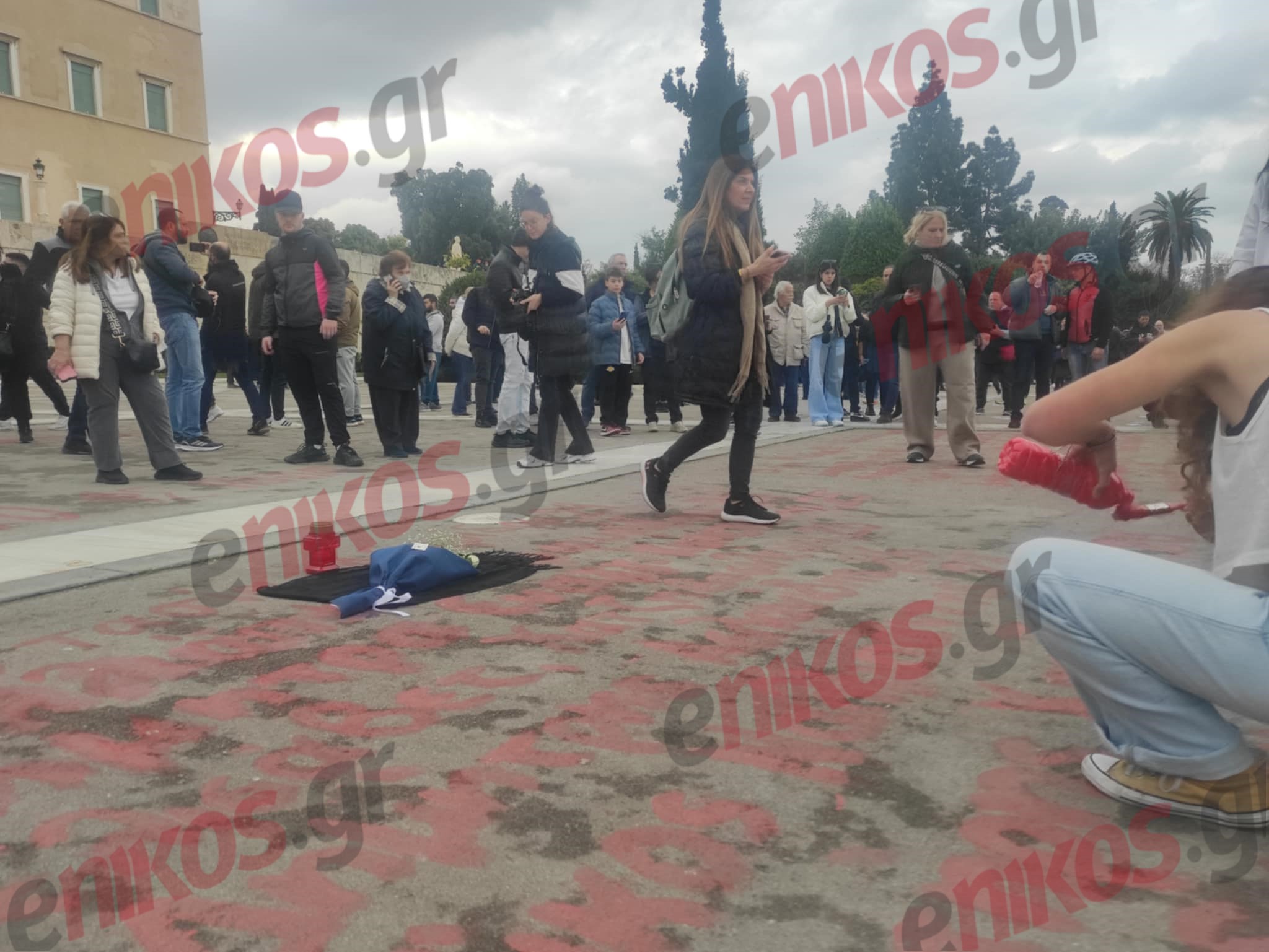 Πολίτες που συγκεντρώθηκαν στην πλατεία Συντάγματος έγραψαν τα ονόματα των 57 θυμάτων της τραγωδίας των Τεμπών με κόκκινη μπογιά μπροστά στο Μνημείο του Αγνώστου Στρατιώτη.