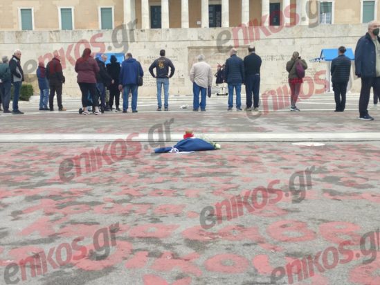 Πολίτες που συγκεντρώθηκαν στην πλατεία Συντάγματος έγραψαν τα ονόματα των 57 θυμάτων της τραγωδίας των Τεμπών με κόκκινη μπογιά μπροστά στο Μνημείο του Αγνώστου Στρατιώτη.