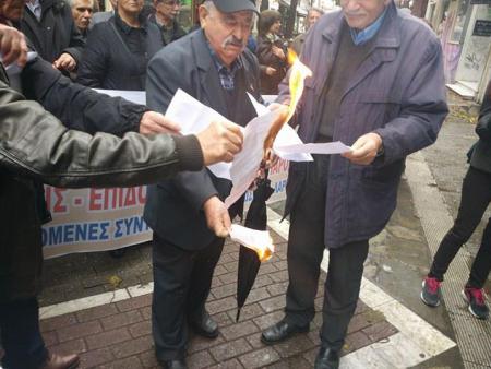 Συνταξιούχοι πραγματοποίησαν συγκέντρωση διαμαρτυρίας έξω από τα γραφεία του ΙΚΑ στη Λάρισα, καίγοντας συμβολικά την επιστολή που είχαν παραλάβει από τον πρώην υπουργό Εργασίας Γιώργο Κατρούγκαλο και αφορούσε στις συντάξεις τους.
