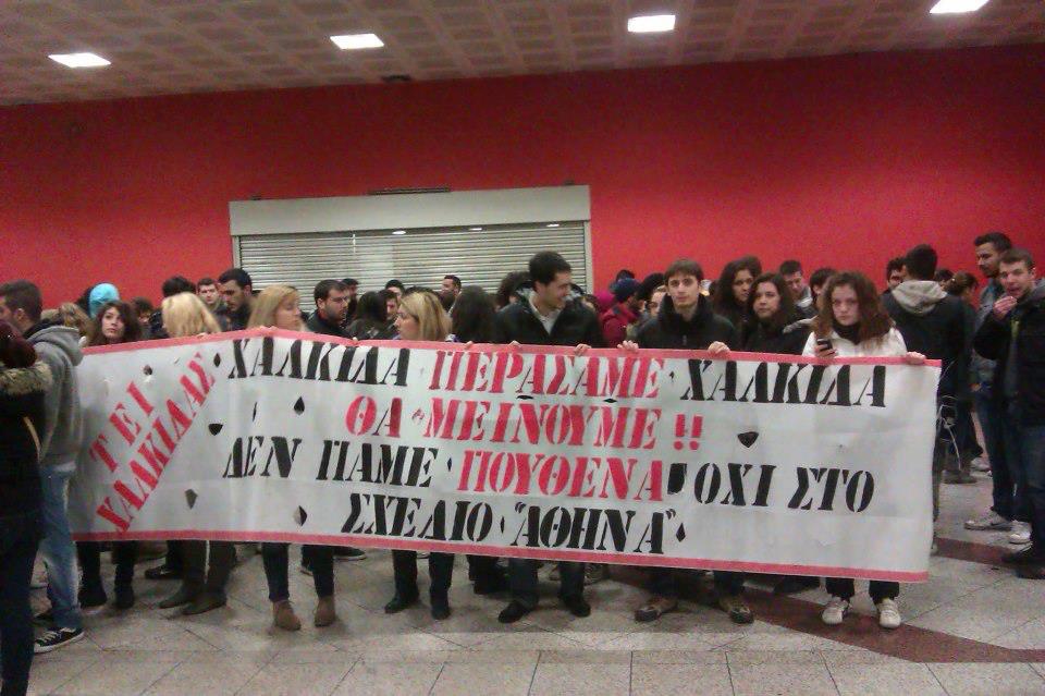 Οι φοιτητές του ΤΕΙ Χαλκίδας, έφτασαν στην Αθήνα και παρά την έντονη βροχόπτωση διαμαρτυρήθηκαν για το σχέδιο «Αθηνά» το οποίο προβλέπει την μεταφορά και την συγχώνευση του τμήματος Διοίκησης Επιχειρήσεων, με το τμήμα Διοίκησης Συστημάτων Εφοδιασμού που λειτουργεί στη Θήβα.