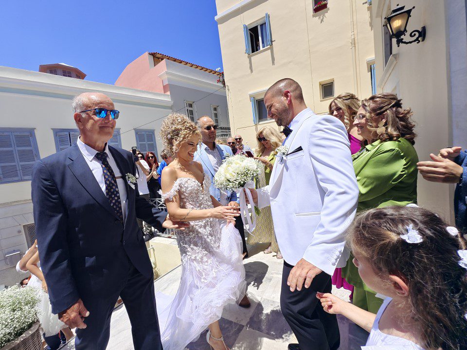 Το πρώτο μυστήριο έλαβε χώρα στον Καθολικό Ιερό Ναό της Ευαγγελίστριας ενώ το δεύτερο, στην Παναγίτσα στα Χρούσσα. Ήταν ένας κεφάτος γάμος, με χαμόγελα, μουσικές, εκπλήξεις για το αγαπημένο ζευγάρι που έδειξε να ξαφνιάζεται ευχάριστα από όσα του είχαν ετοιμάσει οι φίλοι του.