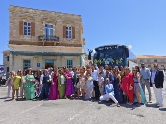 Και αυτό γιατί ο γαμπρός Στρατής Στέφανου, είναι, μεταξύ άλλων και πρόεδρος του ΚΤΕΛ Σύρου, οπότε από το γλέντι δεν μπορούσε να λείπει το λεωφορείο. Kαι αφού η νύφη πήγε στην εκκλησία με όργανα, είναι σαφές ότι ο γαμπρός πήγε με το… λεωφορείο του.