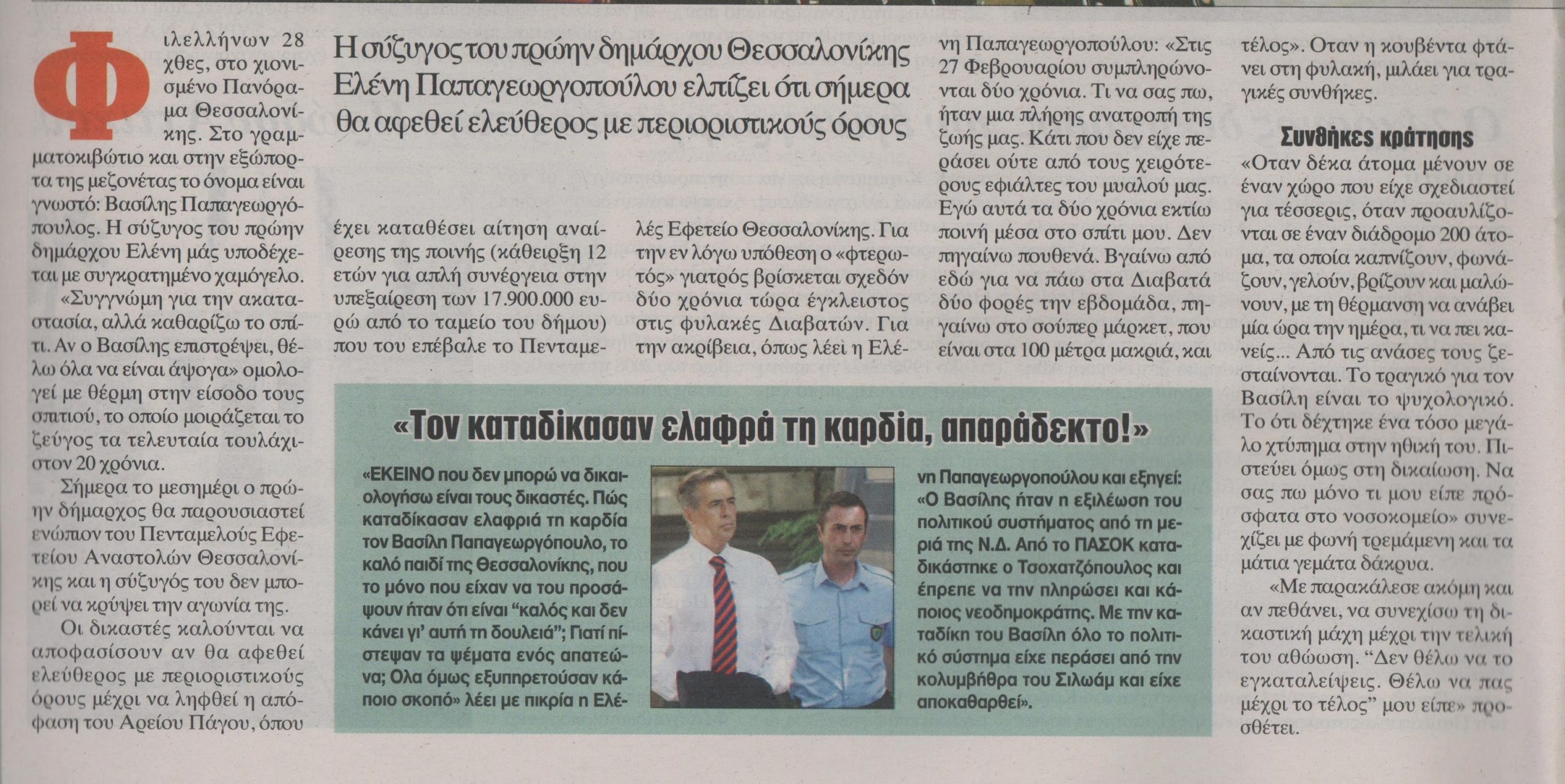 Σήμερα το μεσημέρι ο Βασίλης Παπαγεωργόπουλος θα παρουσιαστεί ενώπιον του Πενταμελούς Εφετείου Αναστολών Θεσσαλονίκης και η σύζυγός του δεν μπορεί να κρύψει την αγωνία της.