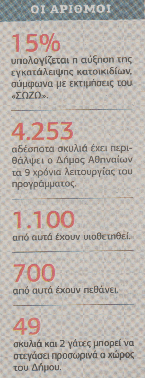 Αύξηση στην εγκατάλειψη κατοικίδιων βλέπουν τόσο οι φιλοζωικές εταιρίες και τα σωματεία, όσο και το πρόγραμμα του Δήμου Αθηναίων για τα αδέσποτα. Σύμφωνα με τα στοιχεία που παρουσιάζει το ρεπορτάζ στα 4.253 ανέρχονται τα σκυλιά που έχει περιθάλψει ο Δήμος τα εννέα χρόνια λειτουργίας του προγράμματος για τα αδέσποτα, εκ των οποίων τα 1.100 έχουν υιοθετηθεί, ενώ τον τελευταίο μήνα έχουν προστεθεί στο πρόγραμμα και οι γάτες, με τον αριθμό τους να ανέρχεται στα 35.