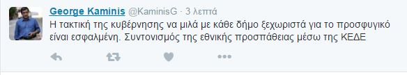 «Η τακτική της κυβέρνησης να μιλά με κάθε δήμο ξεχωριστά για το προσφυγικό είναι εσφαλμένη», αναφέρει ο δήμαρχος της Αθήνας, Γιώργος Καμίνης, με ανάρτηση που έκανε στον προσωπικό του λογαριασμό στο Τwitter, επισημαίνοντας ότι ο συντονισμός θα πρέπει να γίνεται μέσω της ΚΕΔΕ.