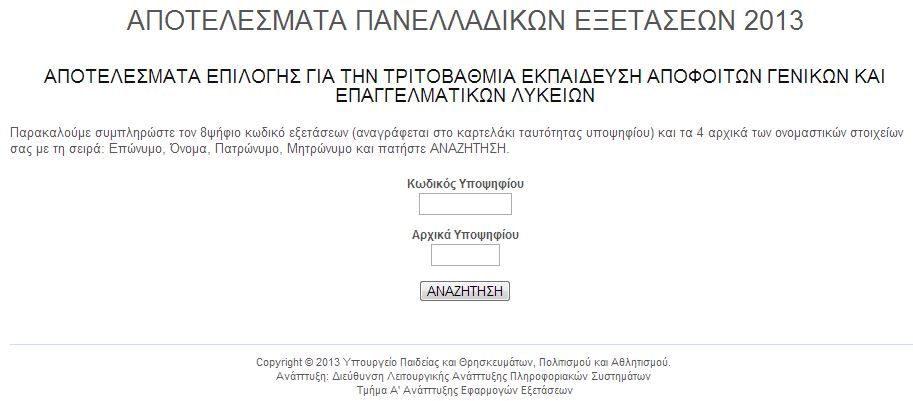 Οι ενδιαφερόμενοι πρέπει να συμπληρώσουν στα ανάλογα πεδία τον αντίστοιχο 8ψήφιο κωδικό εξετάσεων και τα 4 αρχικά των ονομαστικών στοιχείων τους.