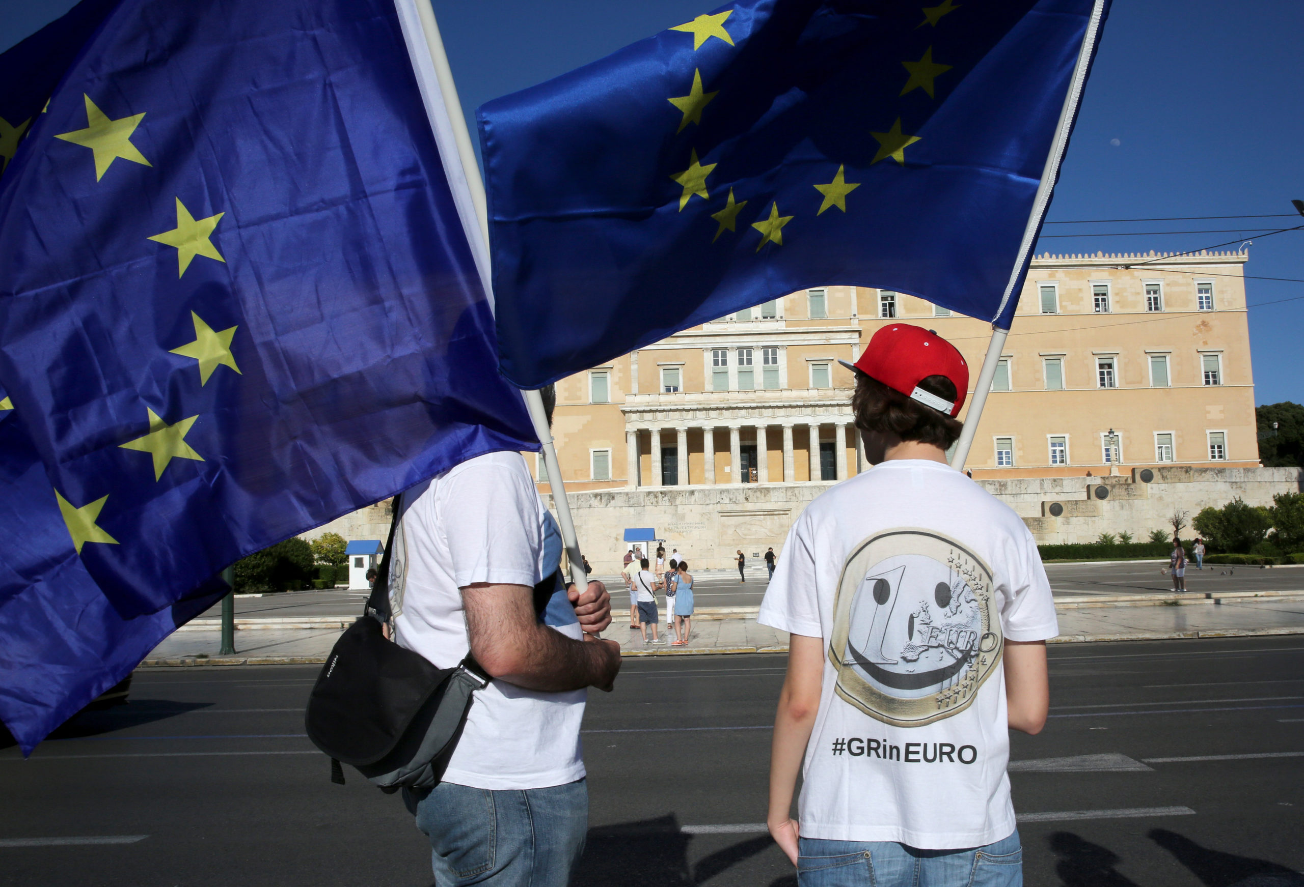“Η Ελλάδα στο ευρώ” γράφουν πάνω τα μπλουζάκια ενώ οι νεαροί κρατούν σημαίες της ΕΕ.
