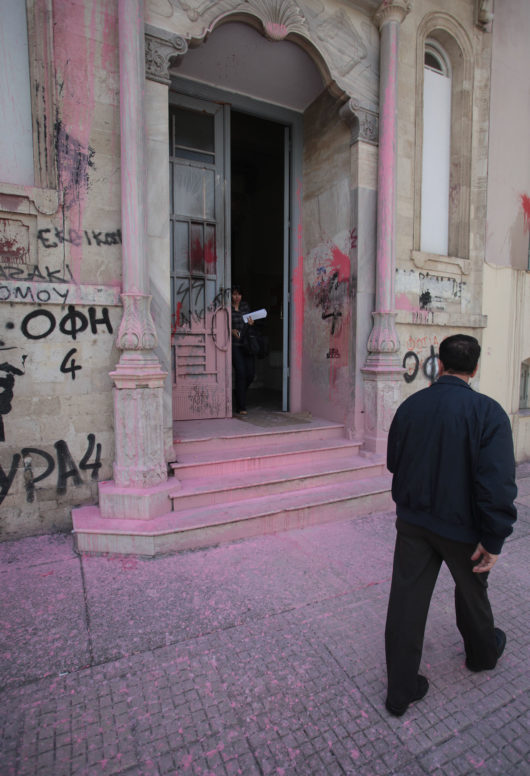 Μία περίεργη εικόνα αντίκρισαν σήμερα το πρωί οι εργαζόμενοι στο δικαστικό Μέγαρο αλλά και οι περαστικοί του Ηρακλείου Κρήτης. Η πόρτα των δικαστηρίων έχει γίνει… ροζ. Δεν πρόκειται για μία προγραμματισμένη εργασία των ειδικών συνεργείων για αλλαγή χρώματος των δικαστηρίων αλλά για… βανδαλισμό.